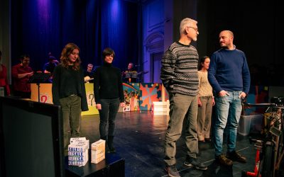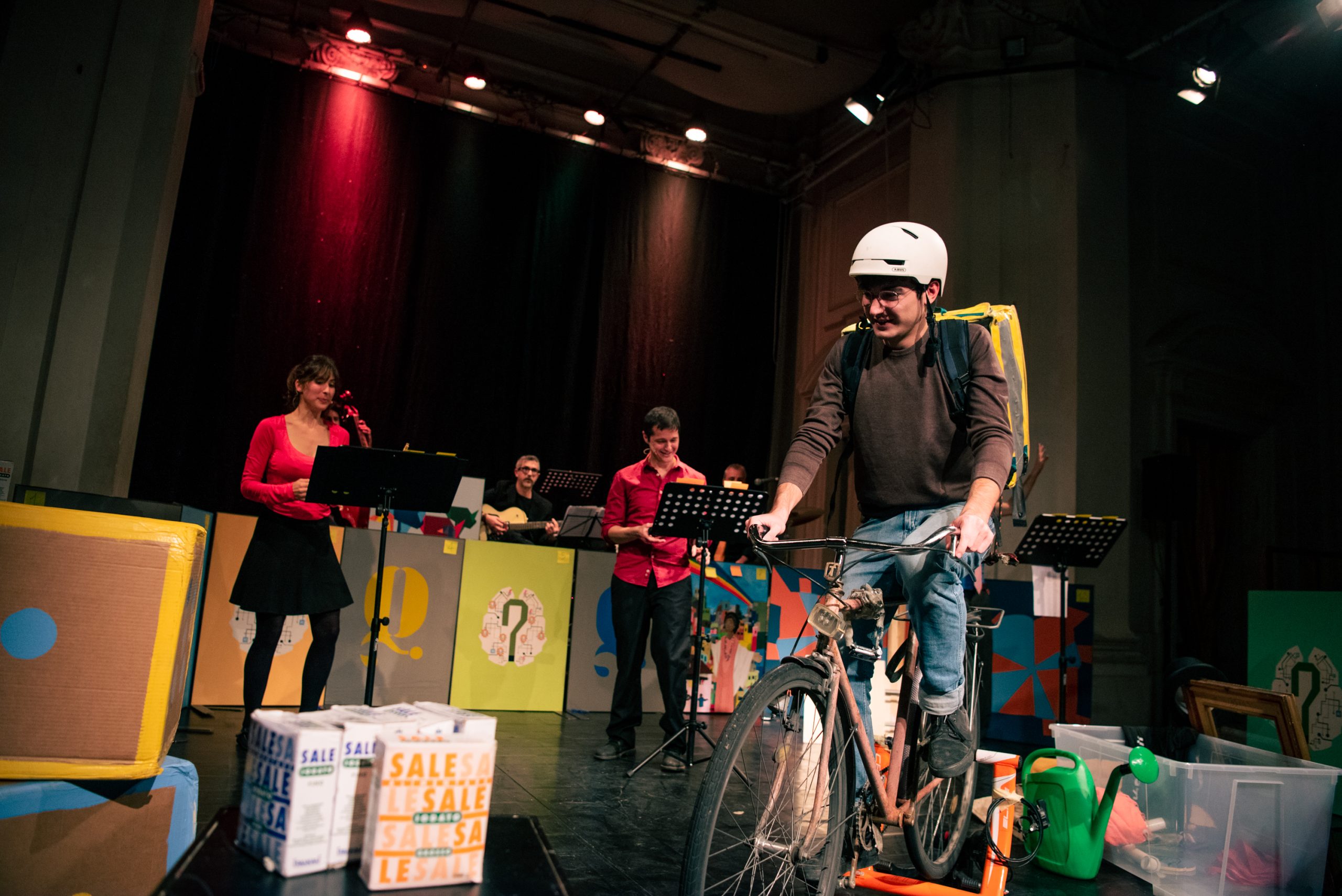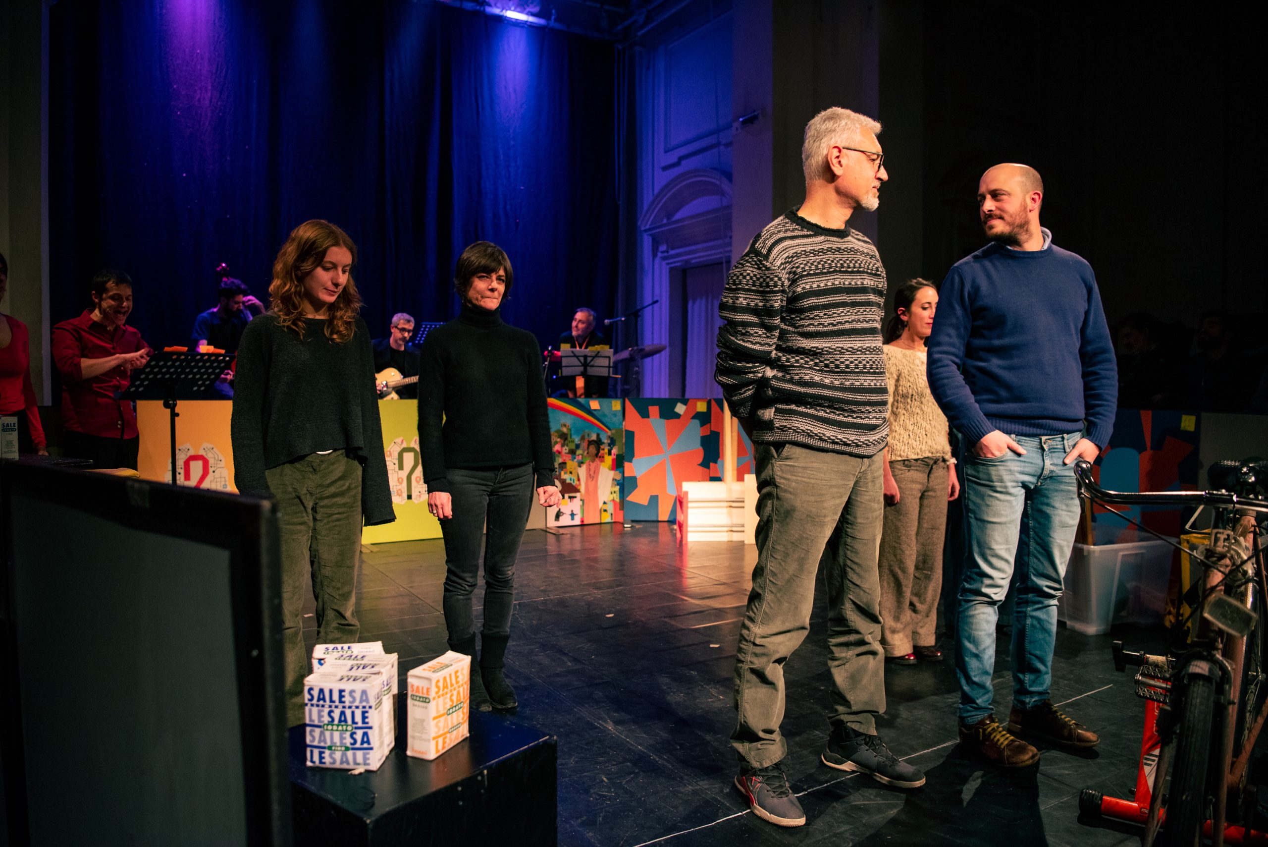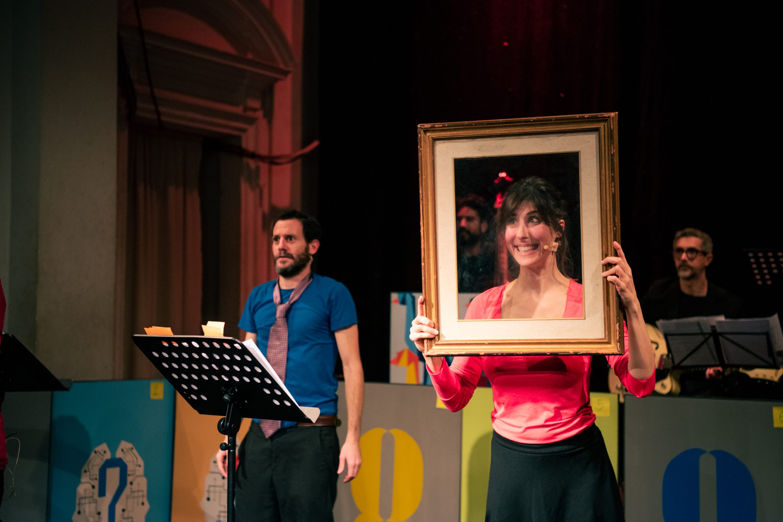 Un presentatore, tre interpreti, musica dal vivo del trio jazz Hot Pots, un tecnico, 50 tessere disegnate dagli studenti e dalle studentesse dell’Accademia Albertina di Belle Arti di Torino. Pedine, dadi giganti e tessere disposte intorno al pubblico che, diviso in due squadre, segue lo sviluppo del gioco scoprendo man mano i contenuti delle caselle.
